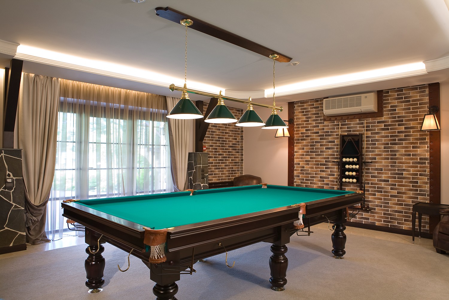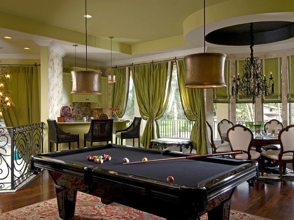 Шторы для бильярдной обычно изготавливаются из тканей зелёных и коричневых оттенков, чтобы они сочетались с зелёным сукном и нежным бархатом мебели, но в наше время столы стали изготавливать и с другим цветом сукна, поэтому теперь появилась возможность разнообразить дизайн бильярдной комнаты. Ну а зелёный цвет навсегда останется классикой.